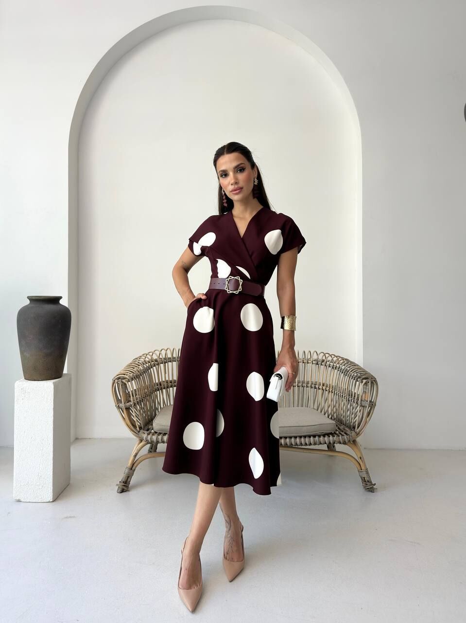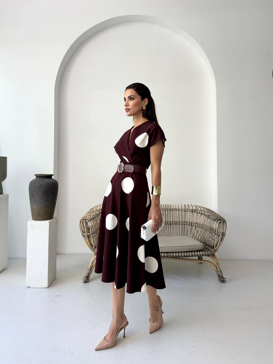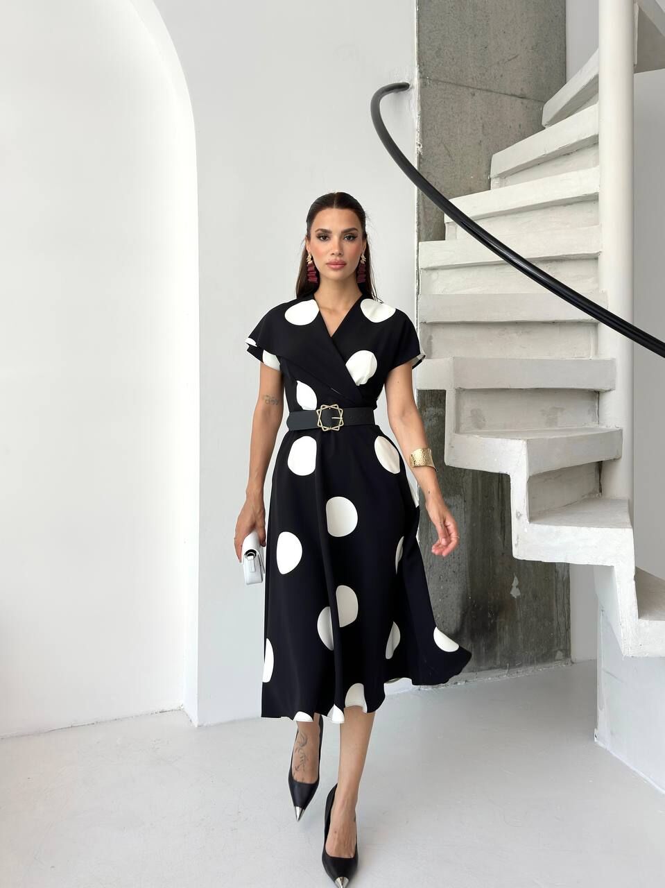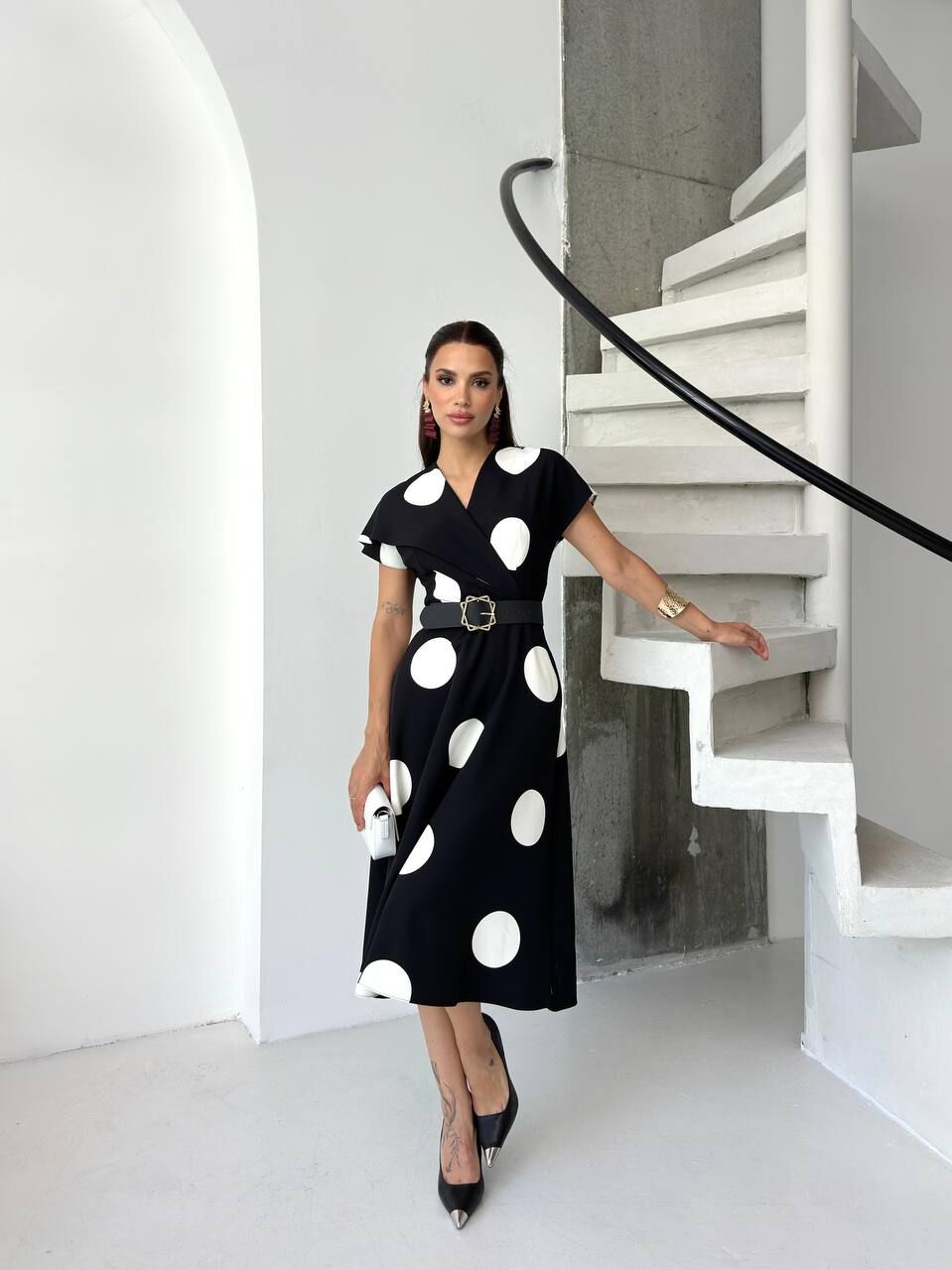 Şık ve zarif puan desenli elbise, her mevsime uyum sağlar. Kaliteli kumaşı sayesinde rahatlık sunar, günlük ve özel davetlerde stilinizi öne çıkarır. Modern kesimi ile vücuda hoşça oturur, kombinlerinize neşe katacak ideal tercih.